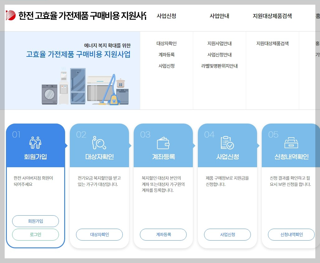 홈페이지 -  한전 고효율 가전제품 구매비용 지원사업 검색 - 홈페이지 회원가입- 대상자 확인- 계좌등록- 신청