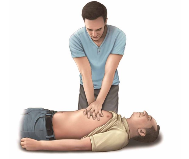 - 팔꿈치는 펴서 수직 방향으로 체중을 이용하여 압박한다.