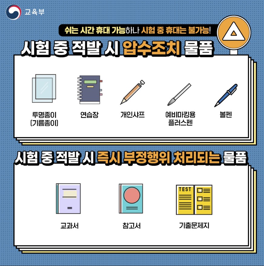 쉬는 시간은 휴대할 수 있으나 시험 중 휴대하면 안 되는 물품
