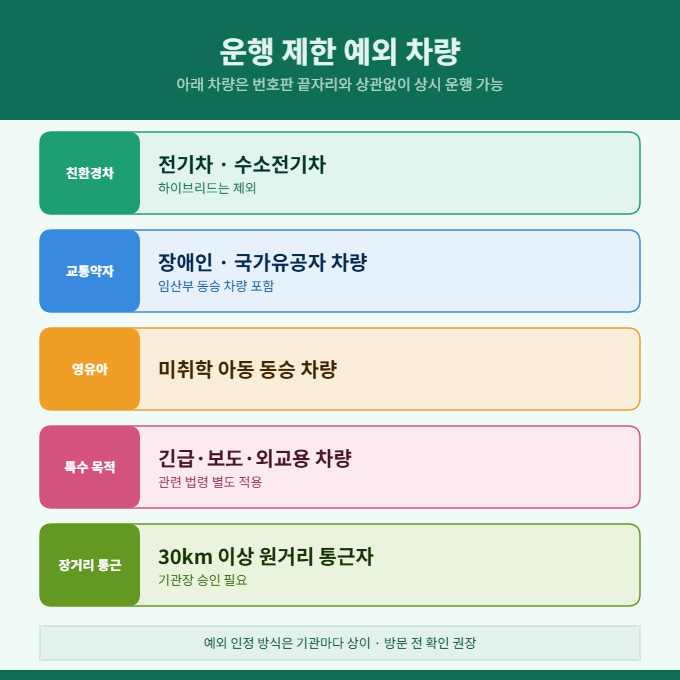 4. 예외 차량: 전기차, 수소차, 장애인/국가유공자 차량, 임산부 및 미취학 아동 동승 차량 등